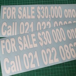 You have the choice of a single line of text or for only an extra $5 you can make it two lines of text. One line of text is great if you just want to say something simple like “FOR SALE ph 021123456” but we recommend going with two lines of text. This way you have space to add a bit more detail like the price (usually pretty important) and perhaps the number of kms the car has driven or the year of manufacture or any other key piece of information your potential buyers may like to know. We’ve even done some stickers for customers who put in a link to a TradeMe auction which is another good idea!